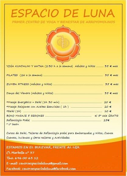 Espacio de luna es el primer centro de yoga de Arroyomolinos. Situado en la calle Marbella 37, enfrente del LIDL nos encontramos con este impresionante NEGOCIO en el que encontrarás multitud de opciones y actividades que regenerarán tu cuerpo y tu mente.